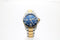 Das zweifarbige Edelstahlgehäuse (Stahl/Gold) mit einem Durchmesser von ca. 41 mm verleiht der Uhr eine markante Präsenz am Handgelenk, während das tiefblaue Zifferblatt mit goldfarbenen Akzenten für einen eleganten Kontrast sorgt. Die einseitig drehbare Lünette und die verschraubte Krone unterstreichen ihren professionellen Charakter.