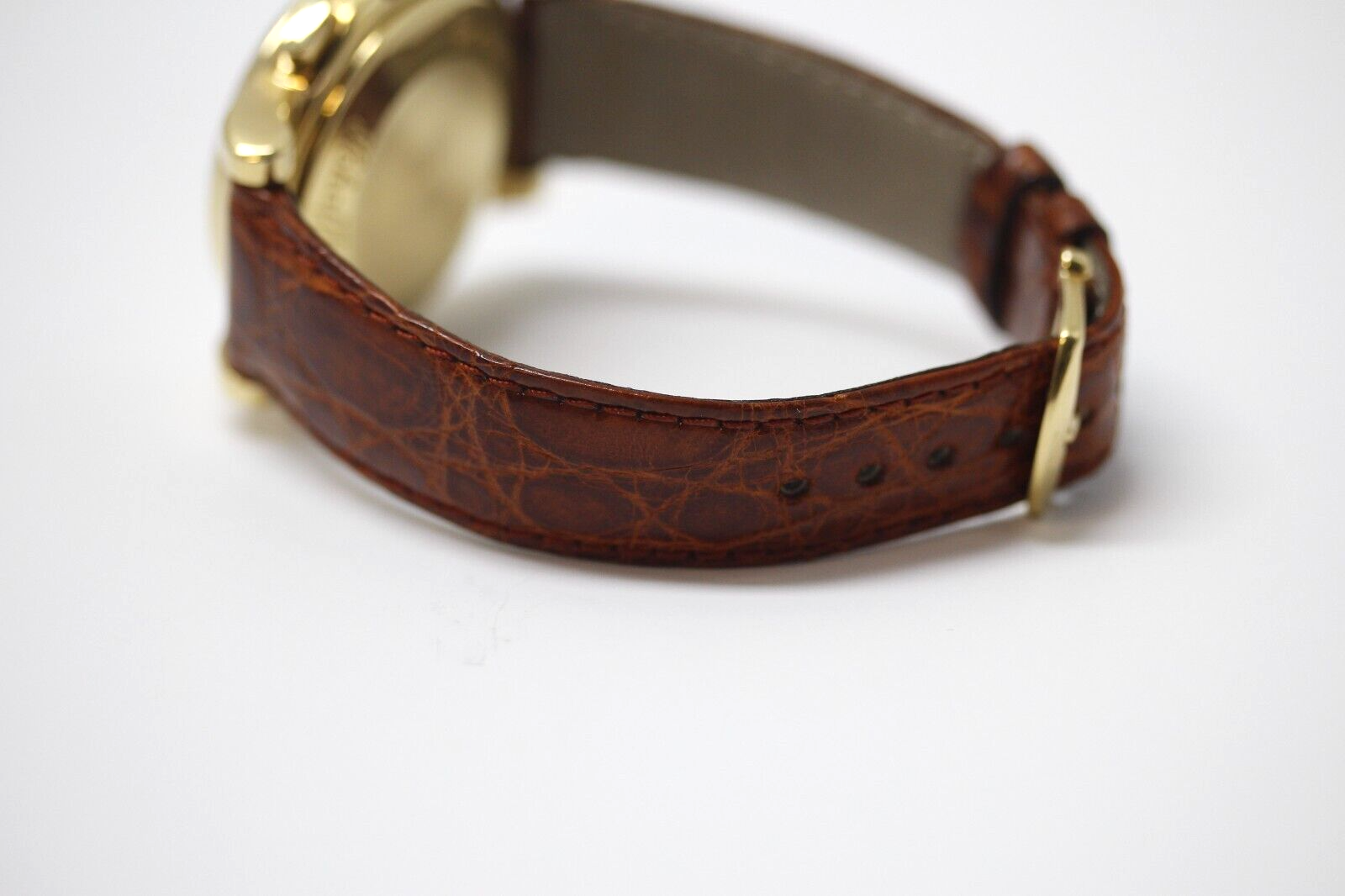 Gehäuse aus 18k Gelbgold mit einem braunem Lederband